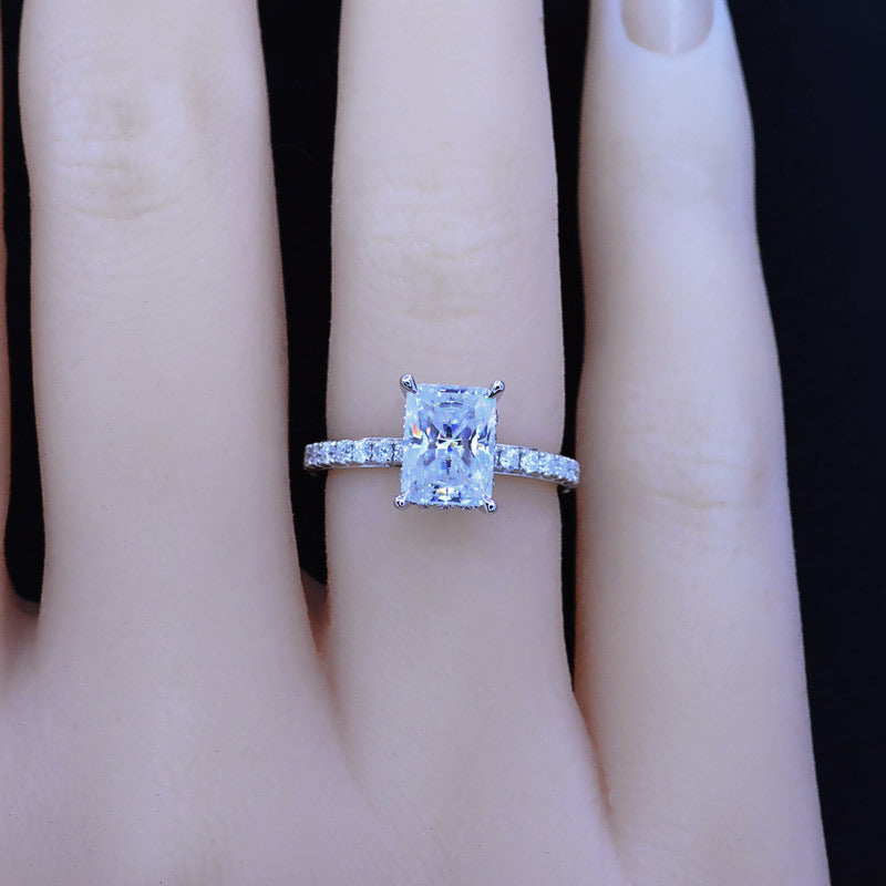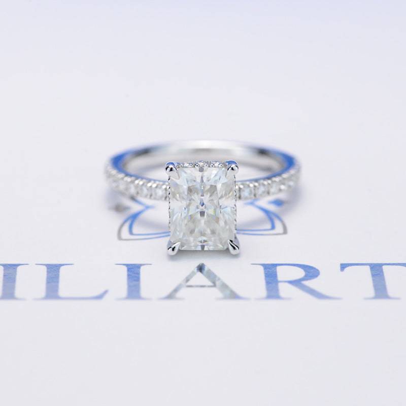 The design features approximately 1 Carat Giliarto Moissanite/Forever One Moissanite/LAB Grown Diamond - Radiant 7x5mm D-Color, SI1-Clarity,VG-Cut,Ex-Polish, VG-Symmetry Center Stone, 0.5 CTW DE Color Moissanite Accents Stones
