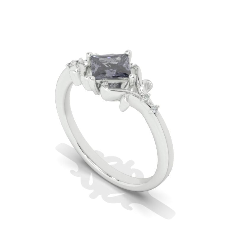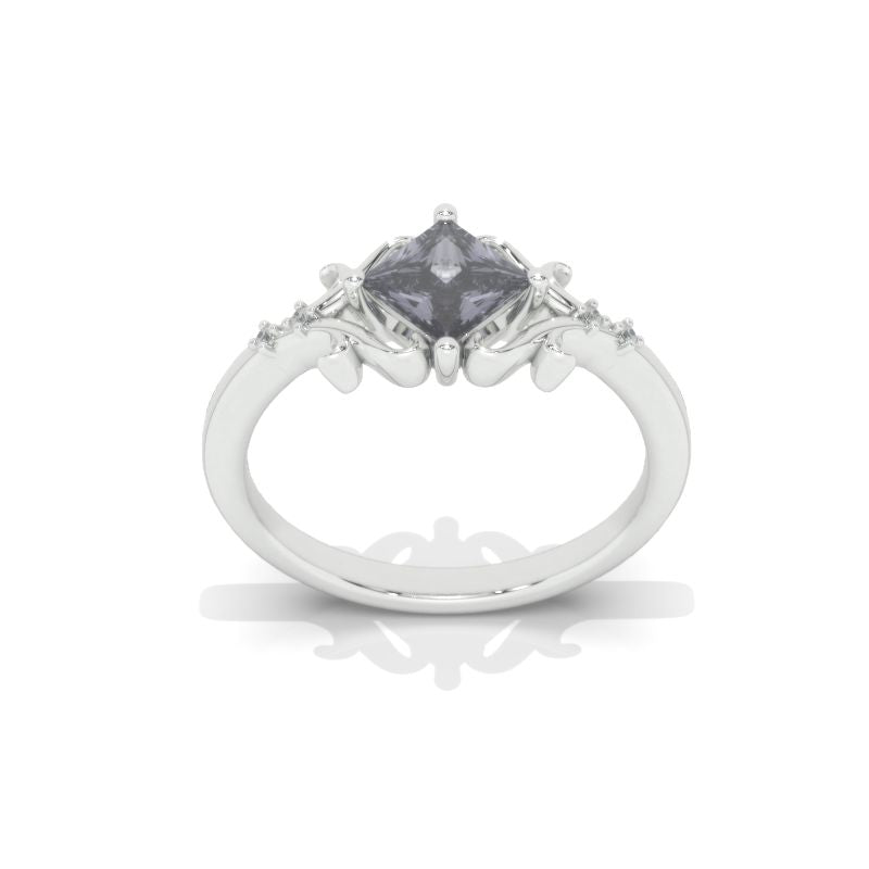 1 Carat Gray Grey Giliarto Moissanite center stone ( I2-Clarity, Ex-Cut, Ex-Polish, VG-Symmetry) and 16 moissanite accent stones (0.3 CTW G-H color, I1 clarity) with