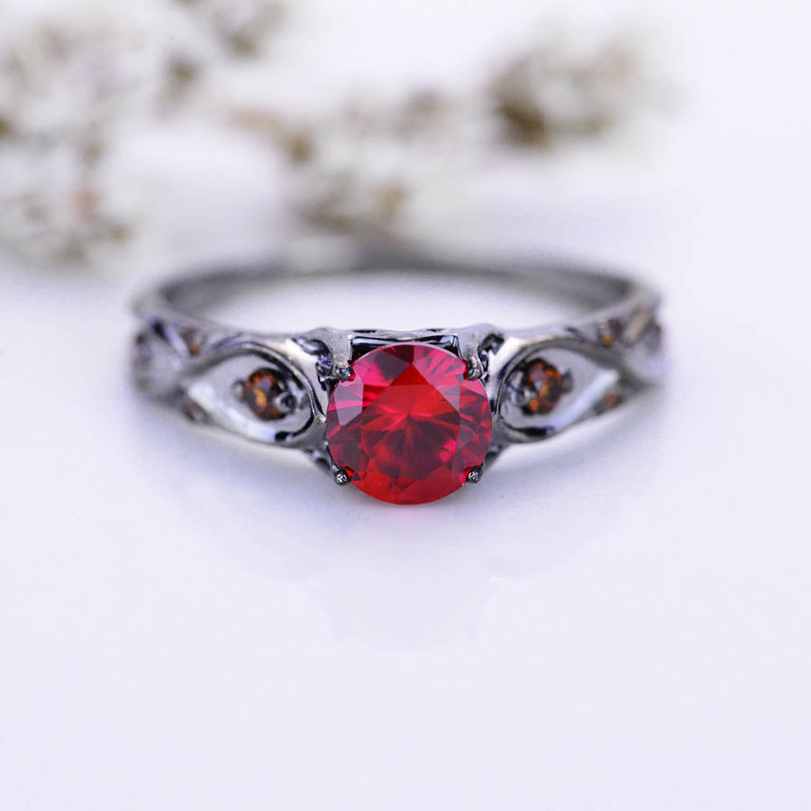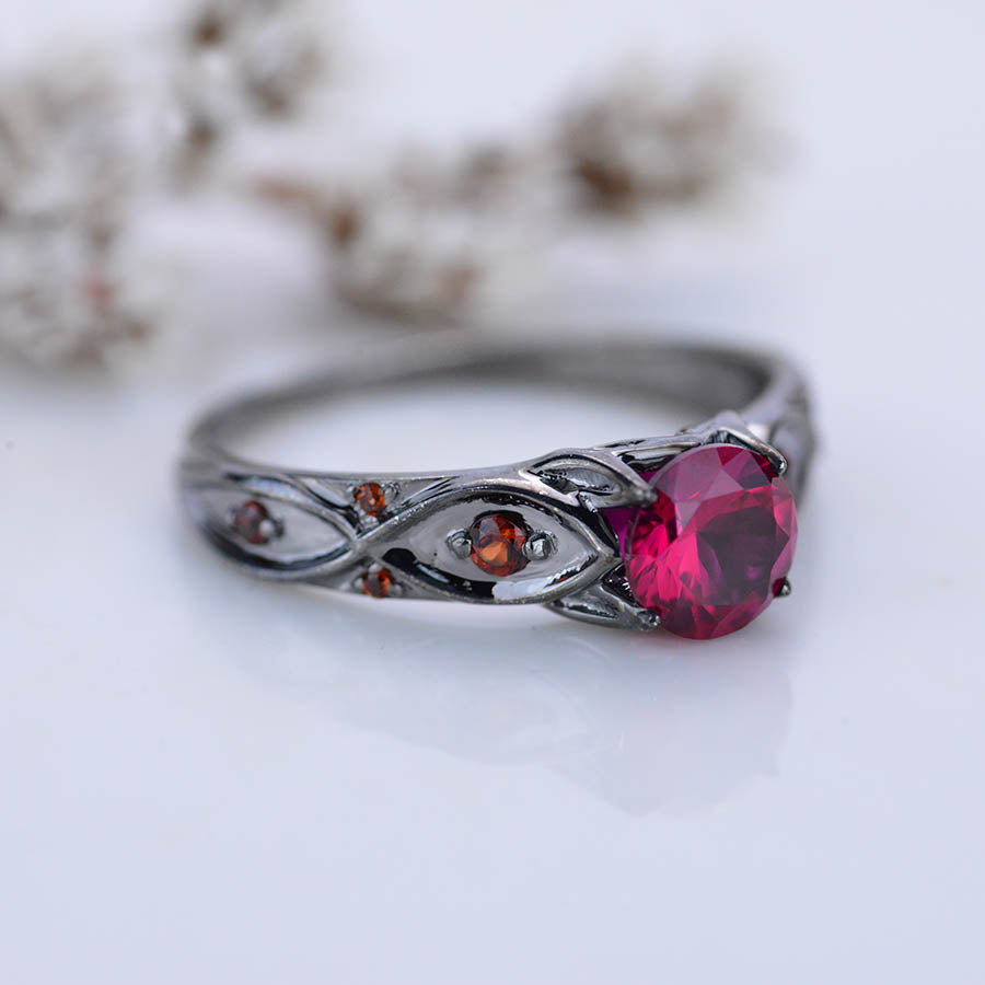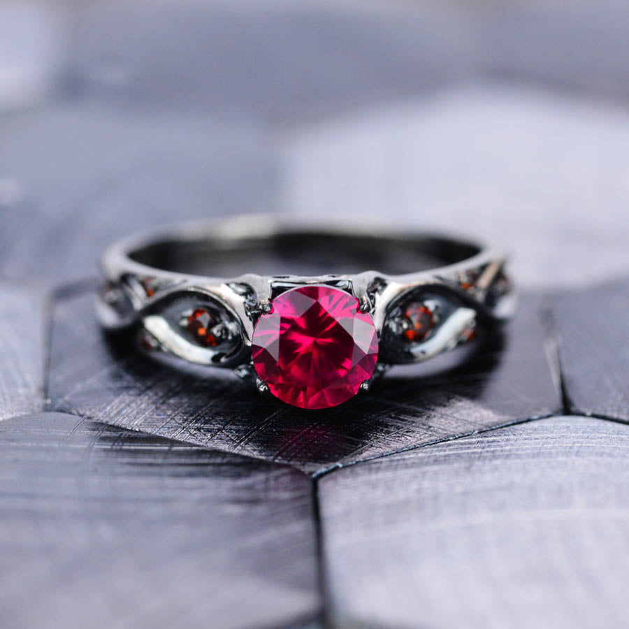 Ethically Lab-Grown Ruby Center Stone - Round 6 mm, SI2-Clarity, Ex-Cut, Ex-Polish, VG-Symmetry) and 8 - Ruby Accents 0.1 CTW with 14K Black Gold or Black Platinum.