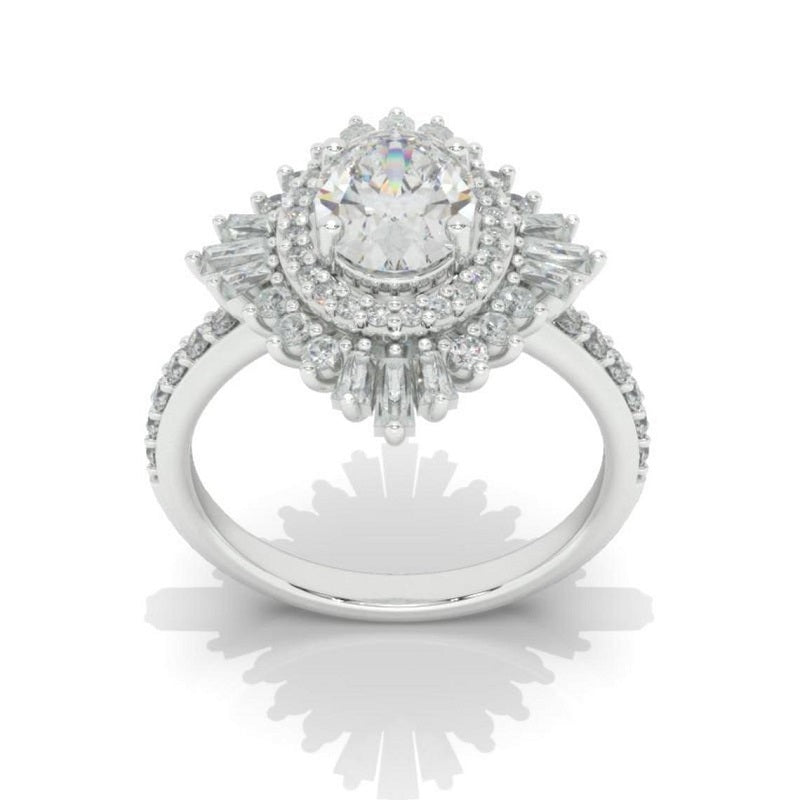 The default design option features 6x8mm Oval Cut Giliarto Moissanite/LAB Grown Diamond Center Stone DEFcolor, SI1-Clarity, VG-Cut, Ex-Polish, VG-Symmetry