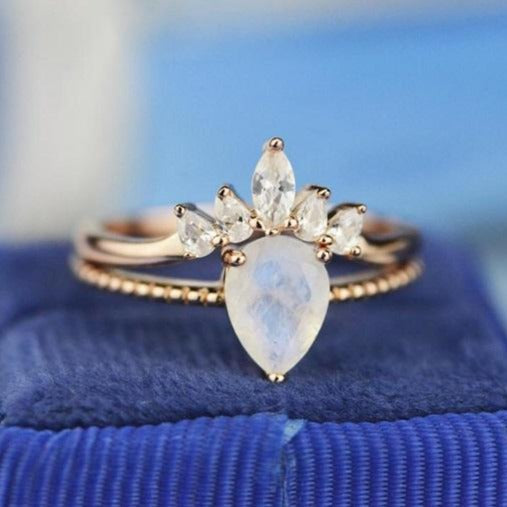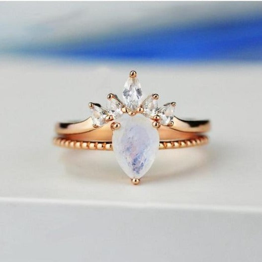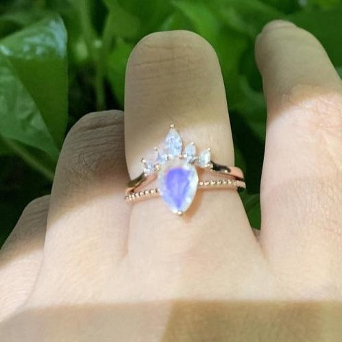 14K Solid Rose Gold Dainty Natural Moonstone Ring Set, 2ct Pear Cut Moonstone Ring Set, Rose Gold Ring Unique Curved Marquise Cut Ring
