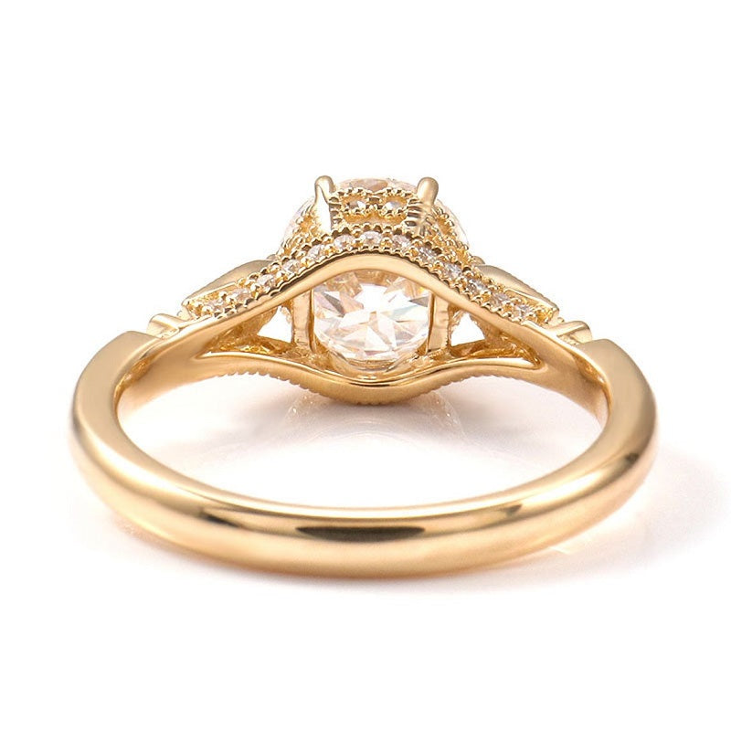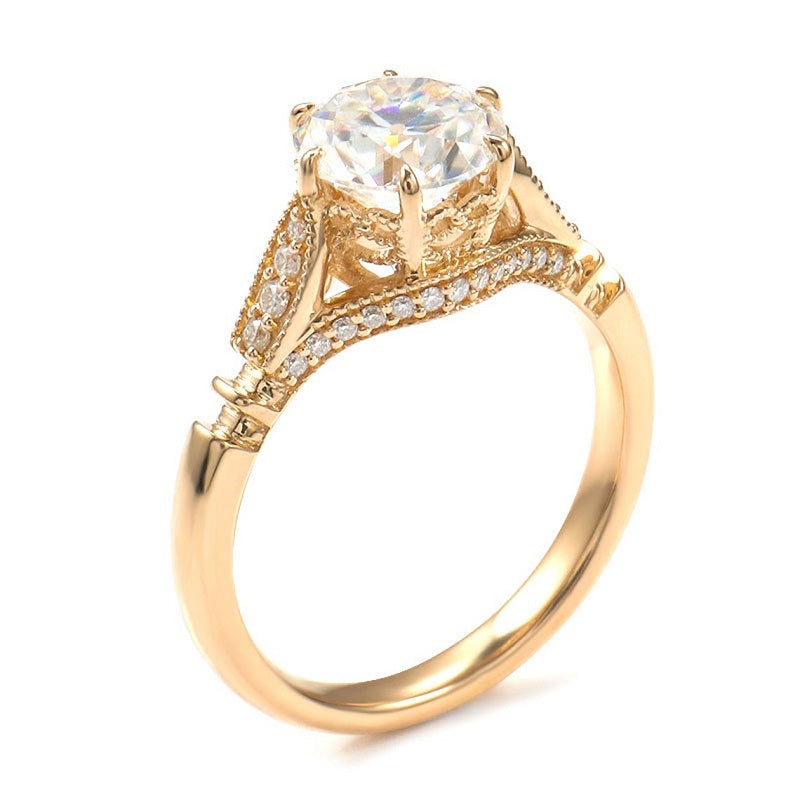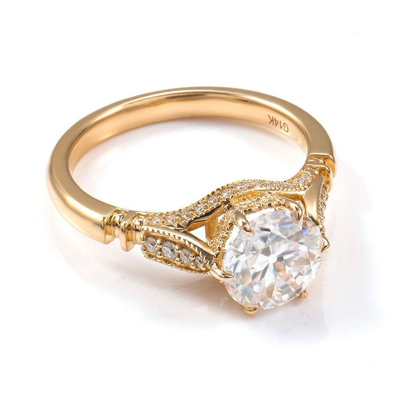 14K Solid Yellow Gold 1.5CT Round Moissanite Solitaire Six Prongs Ring, Vintage Milgrain Engagement Ring Anniversary Promise Gold Ring