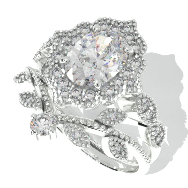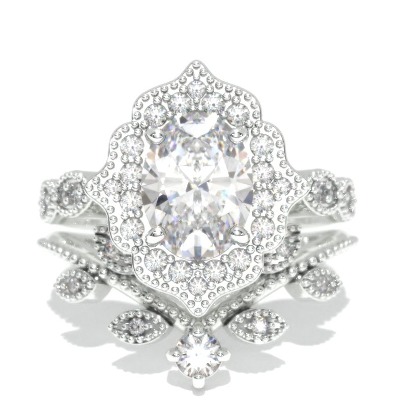 14K White Gold 1.9 Carat Oval Moissanite Halo Engagement Ring Eternity Ring Set