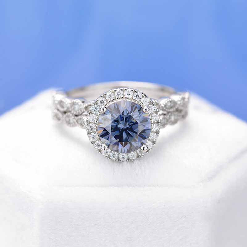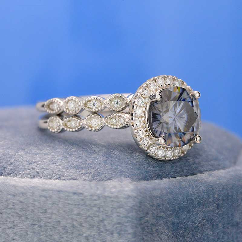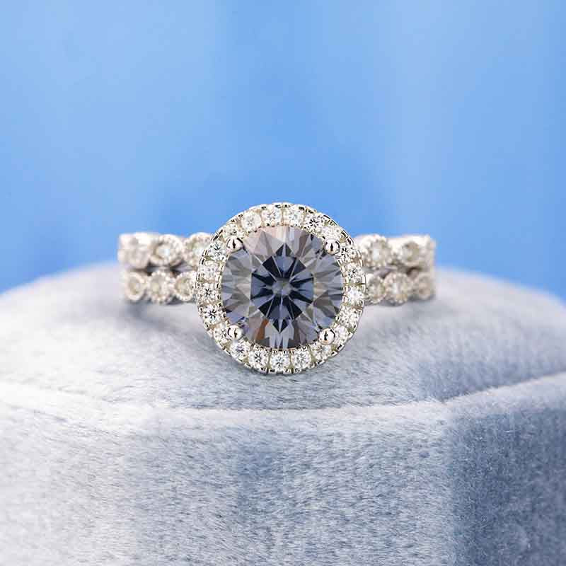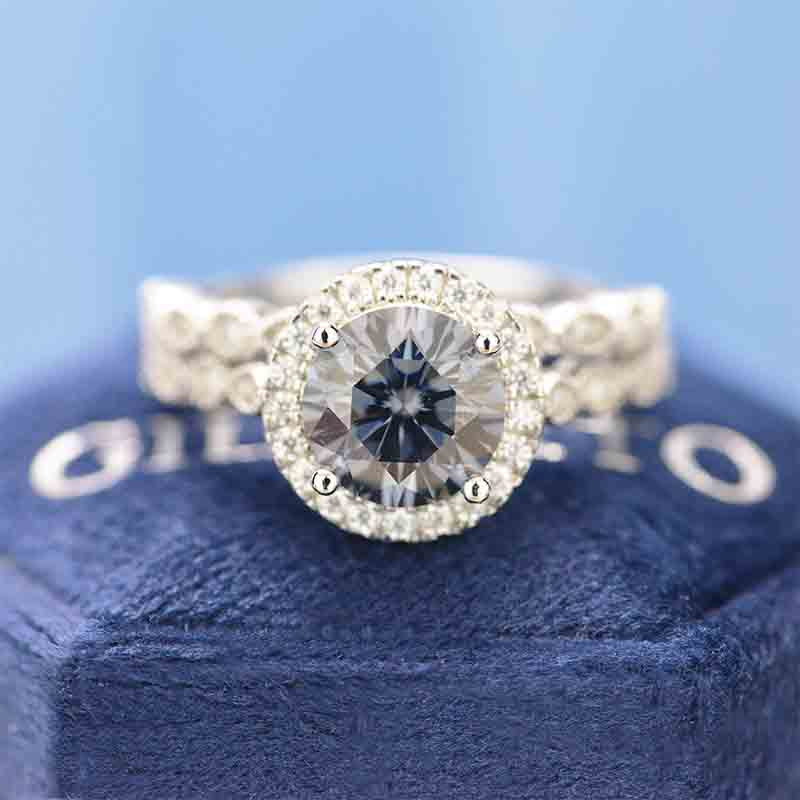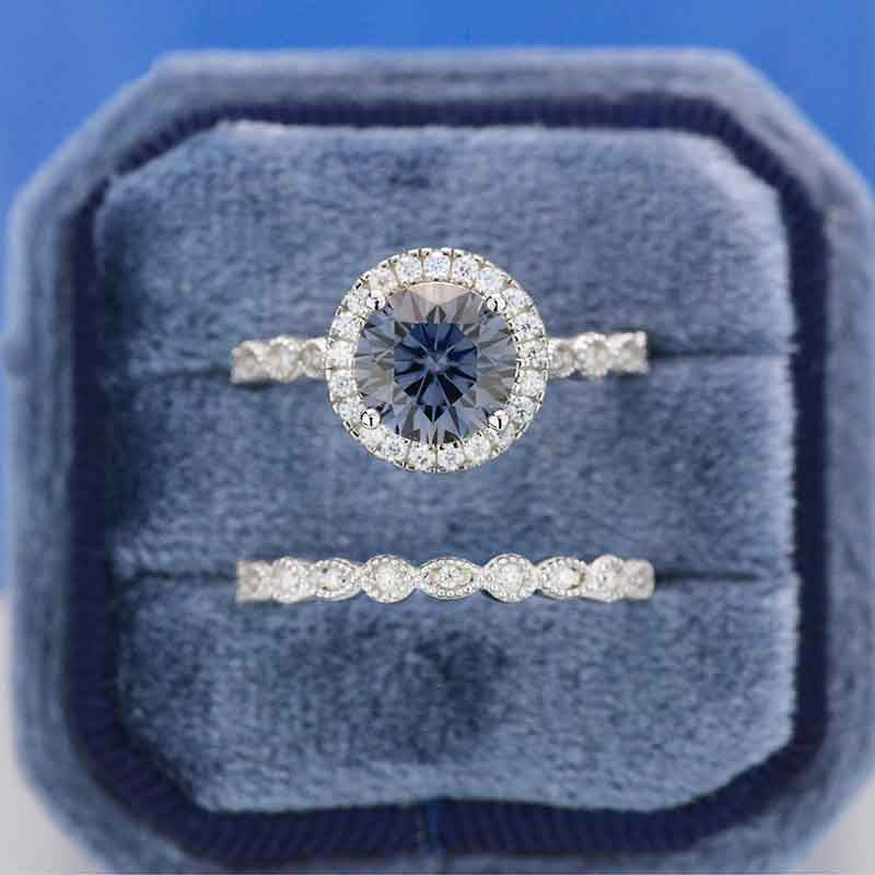 2.0 Carat Dark Gray-Blue Color Moissanite Center Stone ( Round 8 mm, I2-Clarity, Ex-Cut, Ex-Polish, VG-Symmetry) with Two Eternity Bands in 14K White Gold.