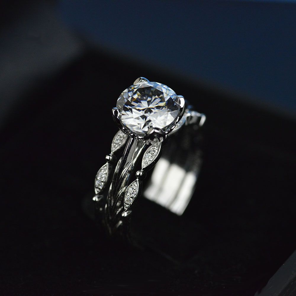2.0  Carat Dark Gray-Blue Color Moissanite Center Stone ( Round 8 mm, I2-Clarity, Ex-Cut, Ex-Polish, VG-Symmetry) with Two Eternity Bands in 14K  White   Gold.