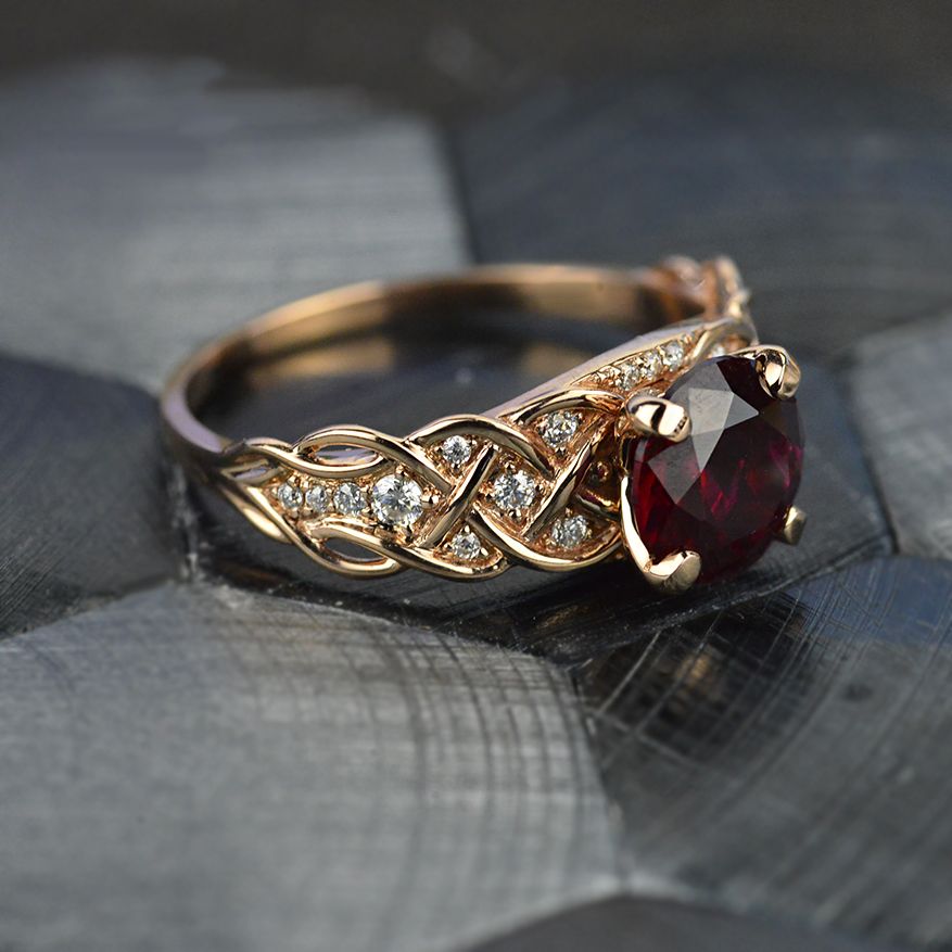 The default design option features 2 Carat Round 8mm Created AAAAA -Grade Ruby Engagement Ring with 24 Natural 0.2 CTW Diamond (HI I2) Accent Stones 14K Rose Gold Ring.