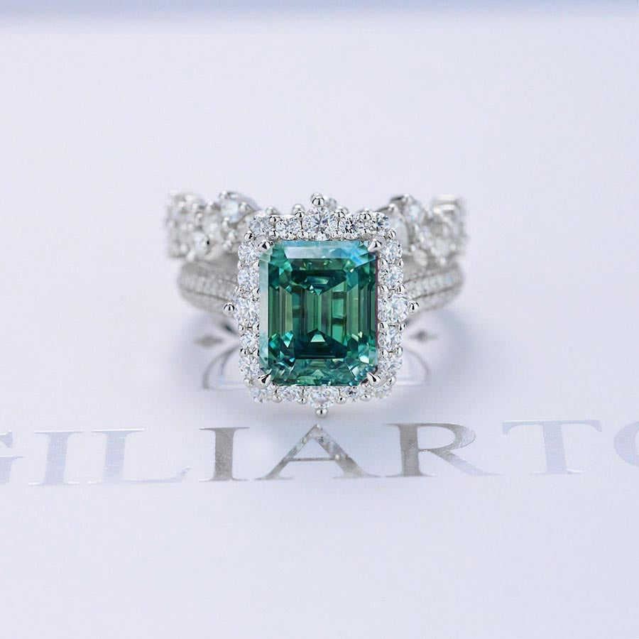 3Ct Green Moissanite Engagement Ring Halo Emerald Cut Green Moissanite Engagement Ring, 9x7mm Step Cut Green Moissanite Engagement Ring with Eternity Band