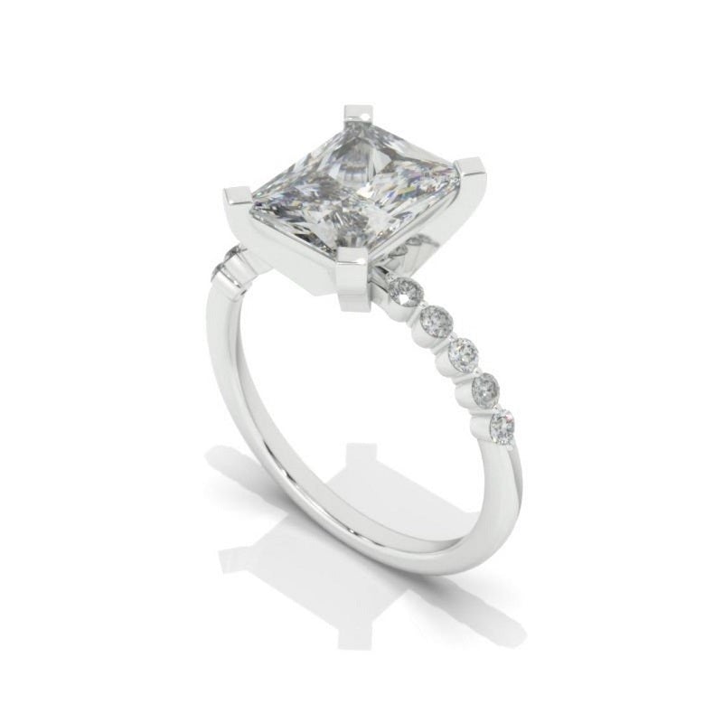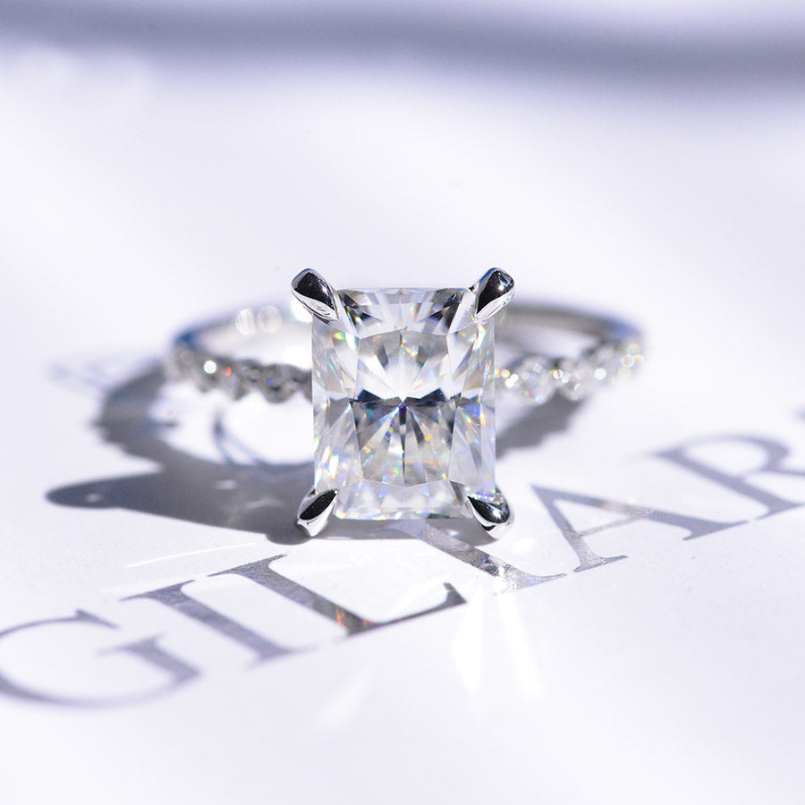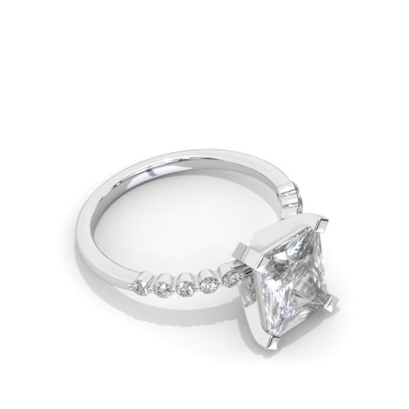The default design option features 9x7mm Radiant Cut Moissanite Center Stone, D -color, SI1-Clarity, VG-Cut, Ex-Polish, VG-Symmetry with moissanite Accent Stones set