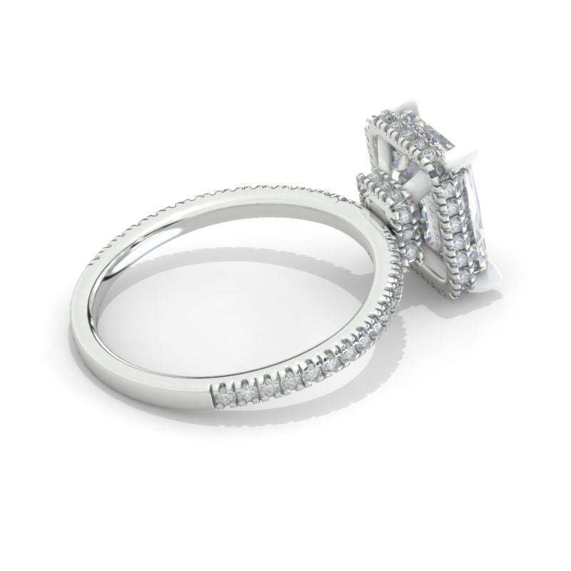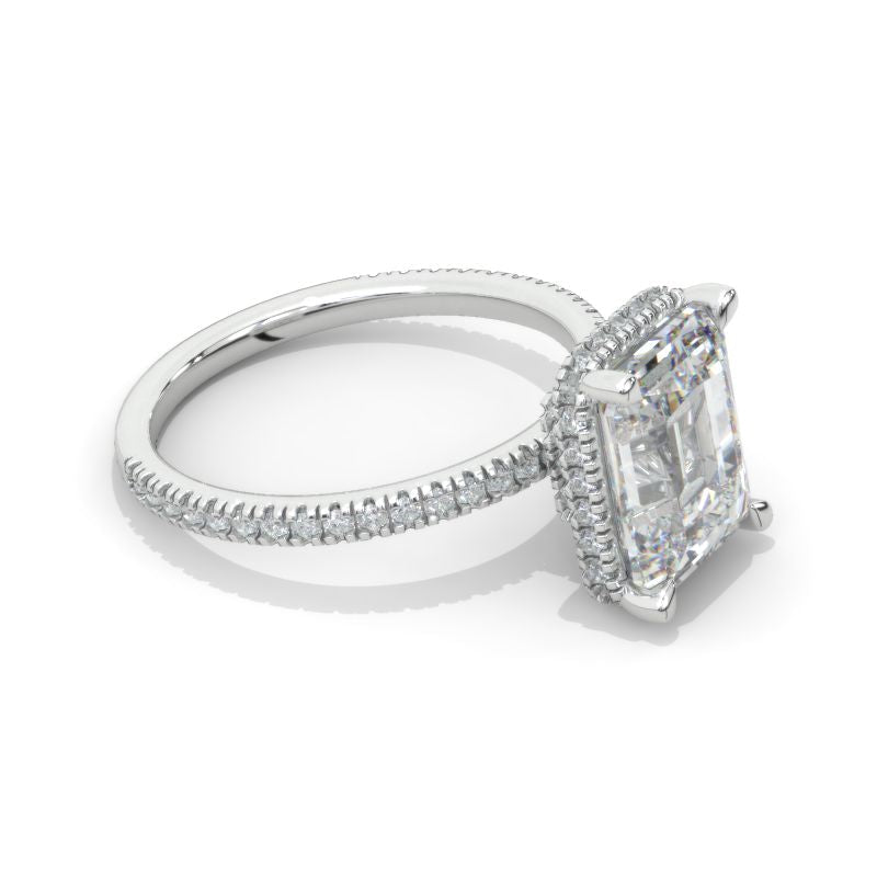The default design option features approximately 4 Carat Giliarto Moissanite- Radiant Cut 10x8mm D-Colorless, SI1-Clarity, VG-Cut, Ex-Polish, VG-Symmetry Center Stone with