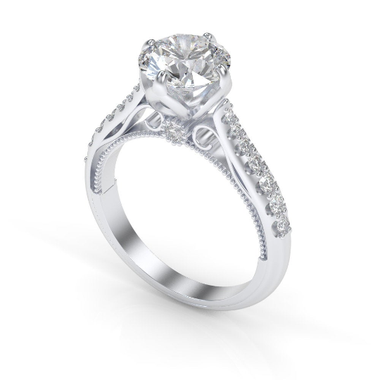 2 Carat Dark Gray Grey Giliarto Moissanite center stone ( I2-Clarity, Ex-Cut, Ex-Polish, VG-Symmetry) and 16 moissanite accent stones (0.3 CTW G-H color, I1 clarity) with