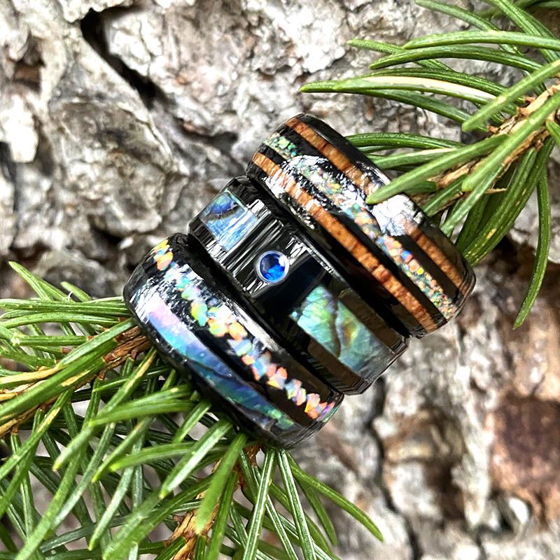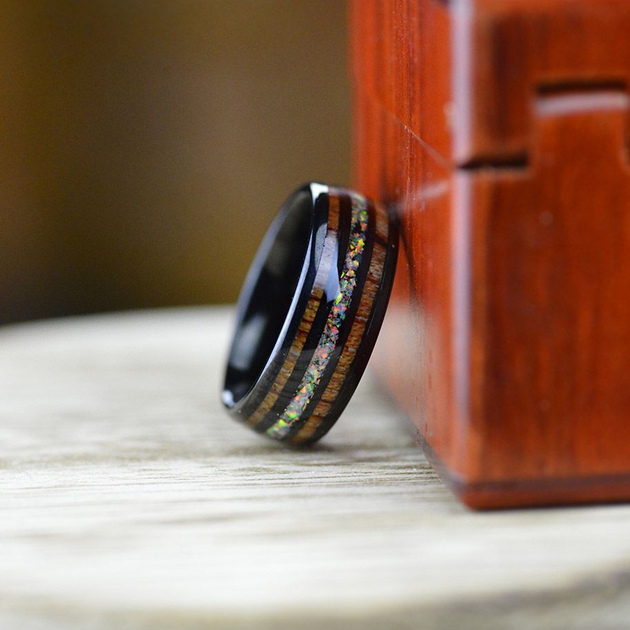 Genuine Opal: Hand-inlaid Genuine Crushed Fire Opal, Which Is An New Option for Tungsten Carbide Jewelry. Double Hawaii Koa Wood Inlay Provides A Dense Grain Pattern That Shows Eternal Strong Love.