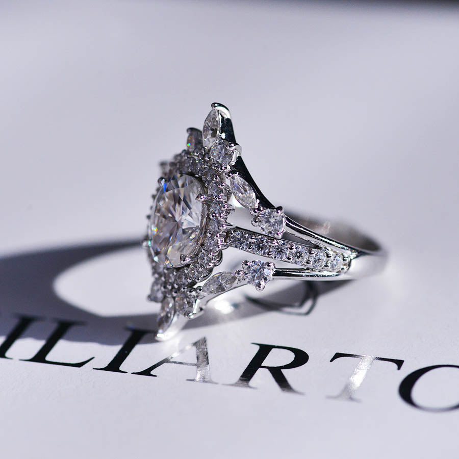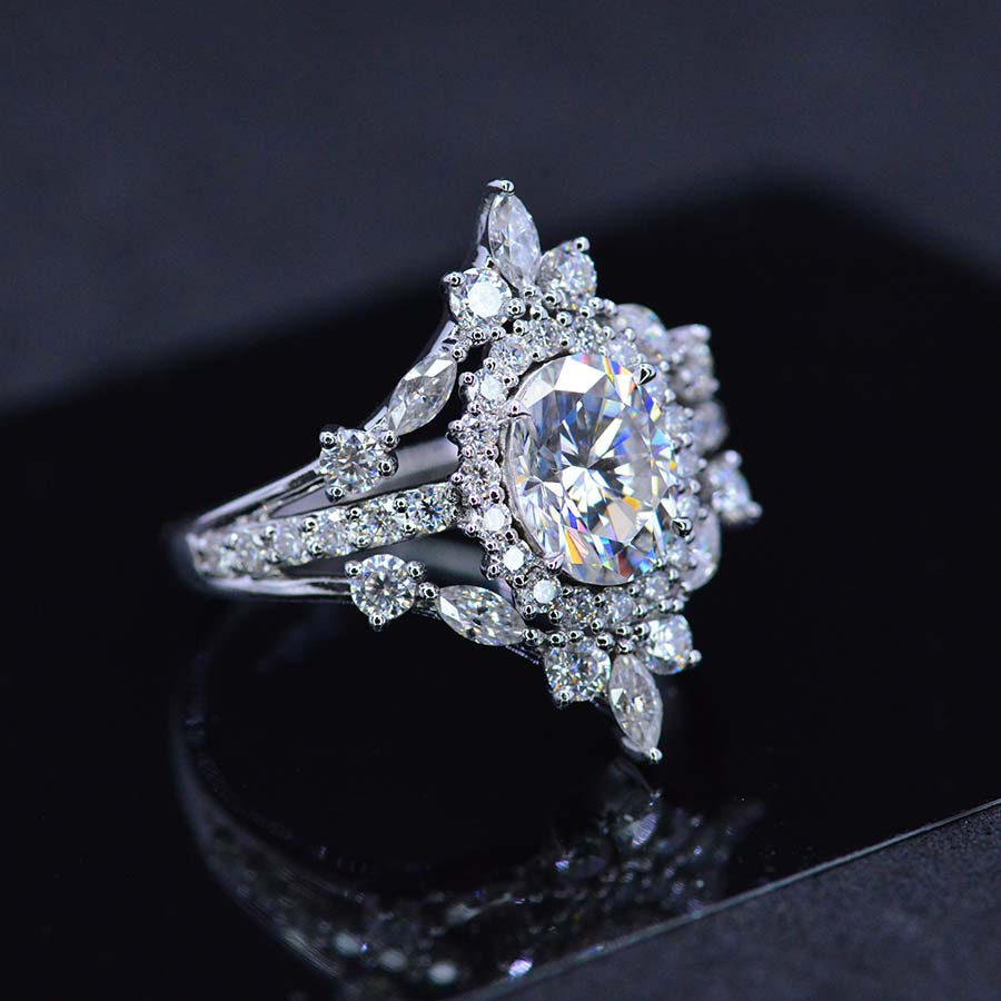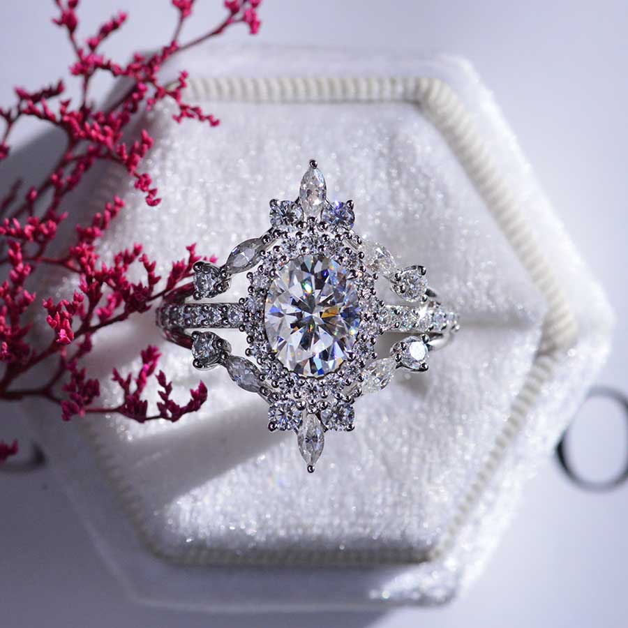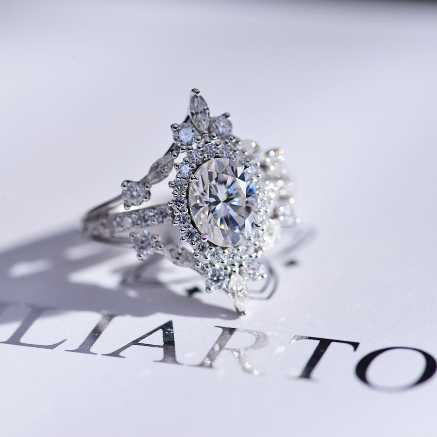 Engagement Ring : Giliarto Moissanite/LAB Grown Diamond Oval 9x7 mm DEF-color, SI1-Clarity, VG-Cut, Ex-Polish, VG-Symmetry Center Stone with 48 Colorless 1.2 CTW Moissanite/Diamond