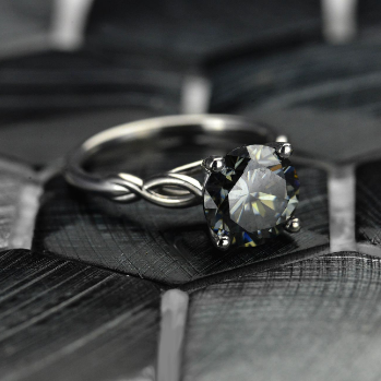 3 Carat Moissanite (Round 9 mm, Dark Gray-Blue Color, I1-Clarity, Ex-Cut, Ex-Polish, VG-Symmetry)   in 14K White Gold  Ring.