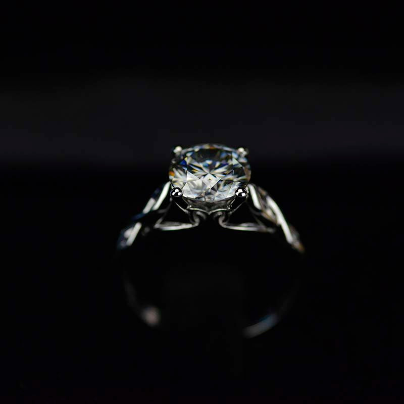 3.5 Carat Moissanite (Round 9 mm, Dark Gray-Color, I1-Clarity, Ex-Cut, Ex-Polish, VG-Symmetry)   in 14K White Gold  Ring.