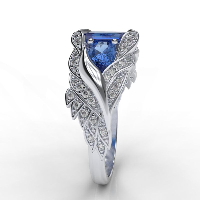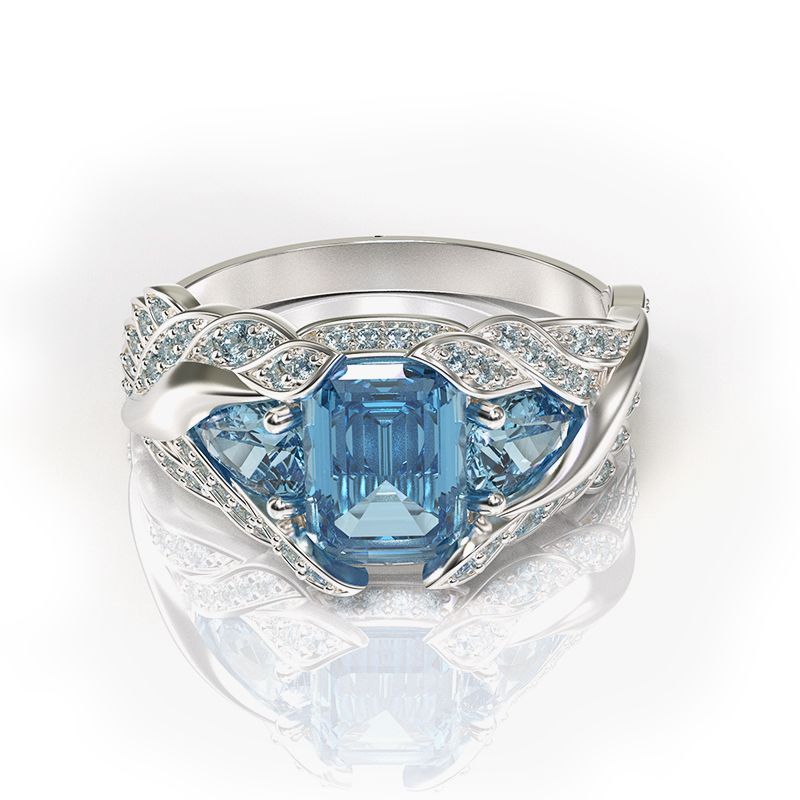2.0 Carat Blue Topaz 8x6mm Emerald Shape Step Cut Center Stone and two Pear 6x4mm 2x0.5 Carat with 62 - 0.3 CTW Moissanite (D color, I1clarity) Accent Stones in