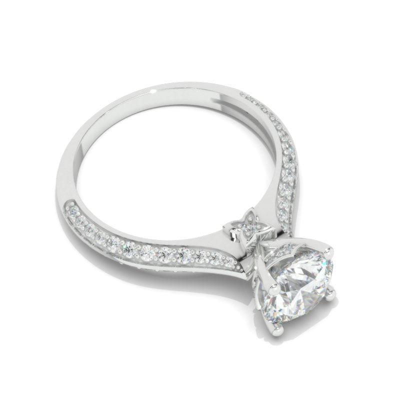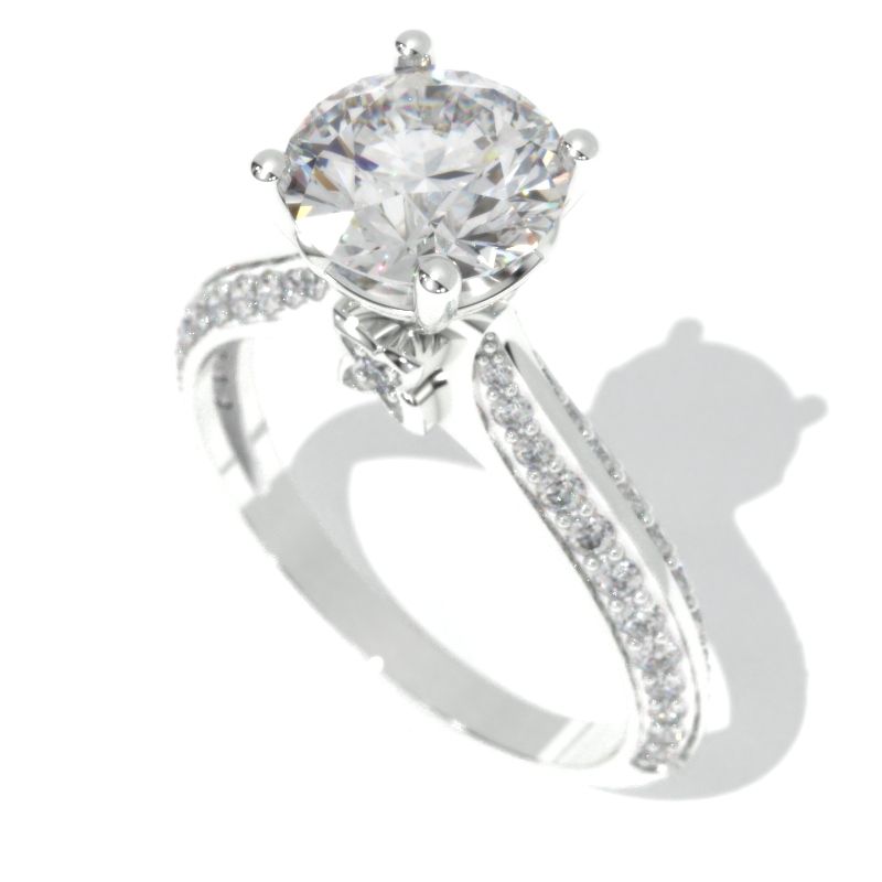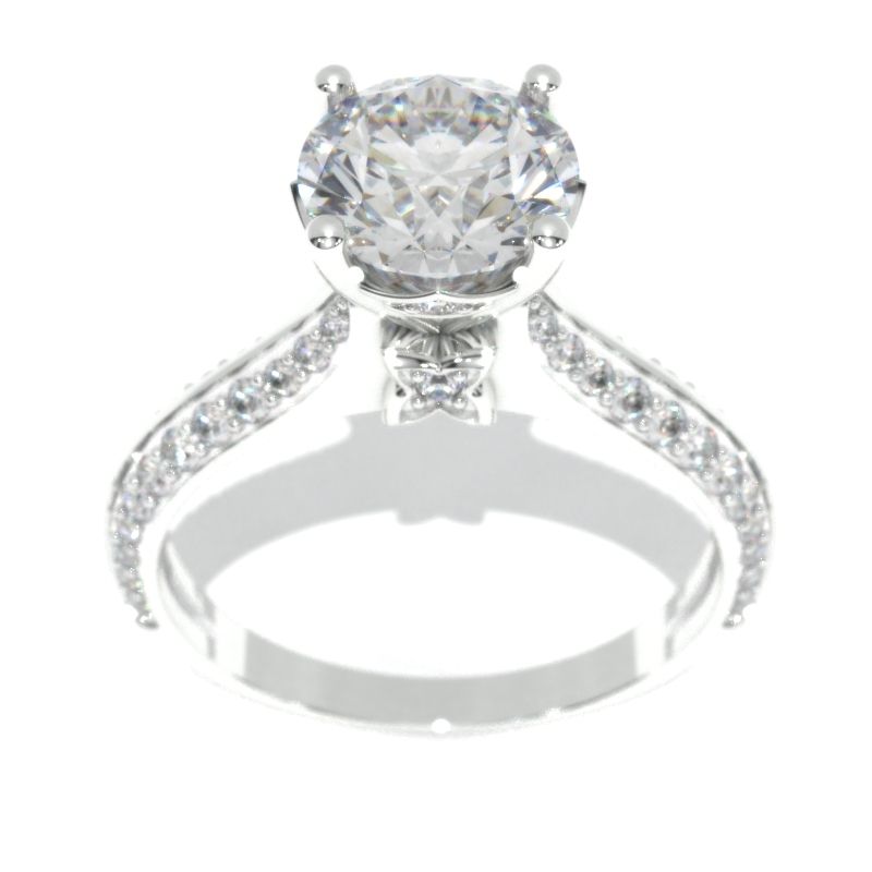 2.0 carat Giliarto moissanite center stone (round 8 mm, DEF-Color, I2-Clarity, Ex-Cut, Ex-Polish, VG-Symmetry) and 64 accent stones ( 0.5 CTW G-H color, I1 clarity) with 14K white gold.