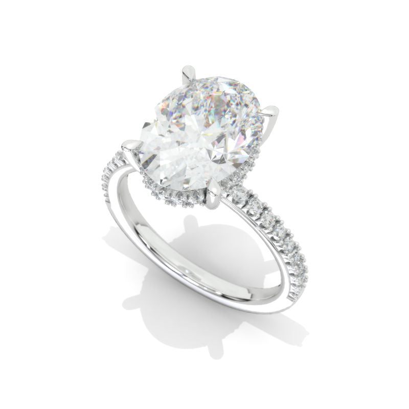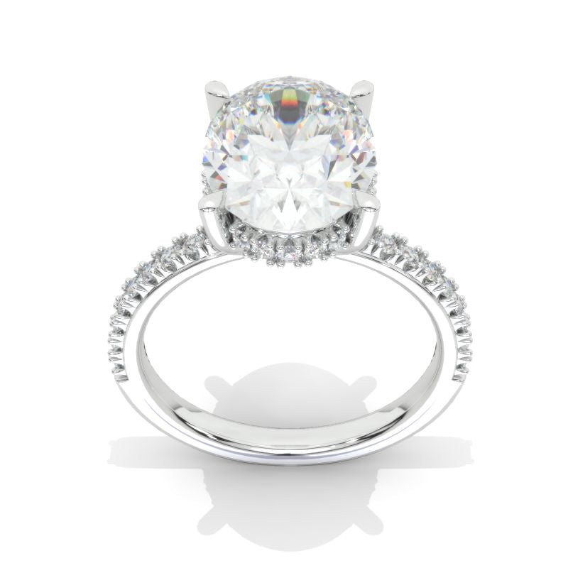 The default design option features 12x9 Oval Giliarto Moissanite/Forever One Moissanite/LAB Grown Diamond Center Stone DEF color, SI1-Clarity, VG-Cut, Ex-Polish, VG-Symmetry