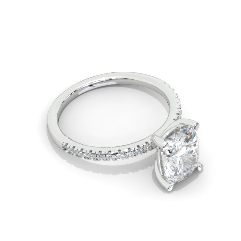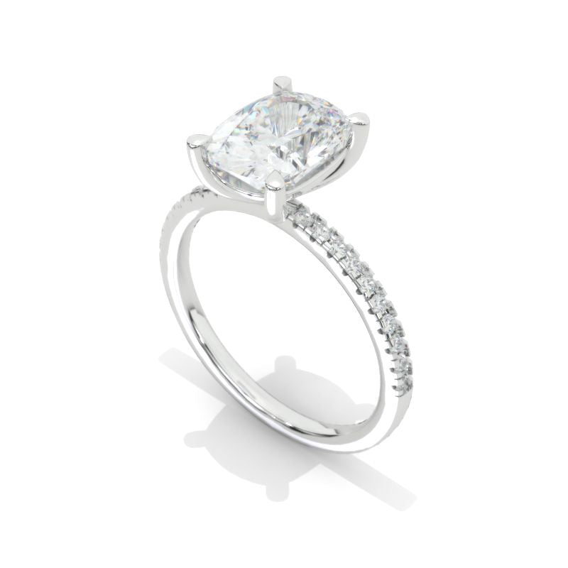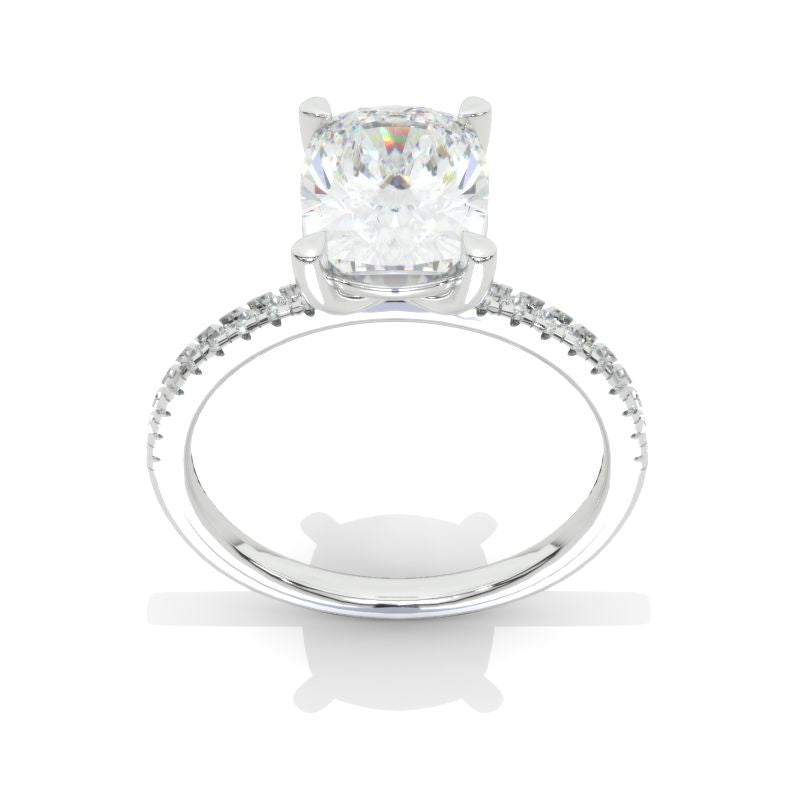 The default design option features 2 Carat 9x7mm Cushion Cut Giliarto Moissanite/Forever One Moissanite/LAB Grown Diamond Center Stone DEFcolor, SI1-Clarity, VG-Cut, Ex-Polish, VG-Symmetry