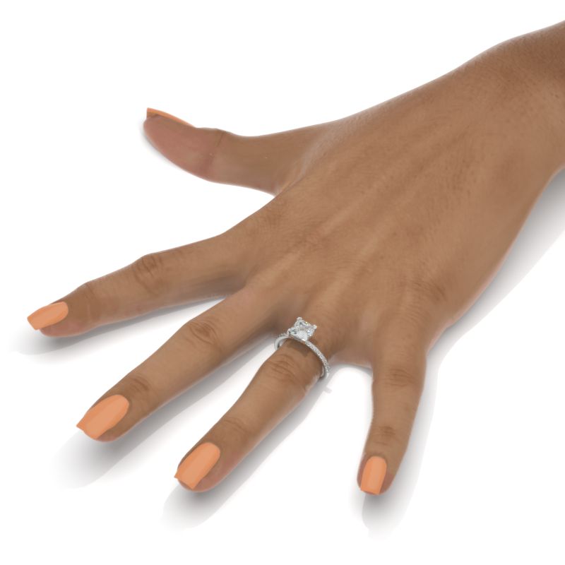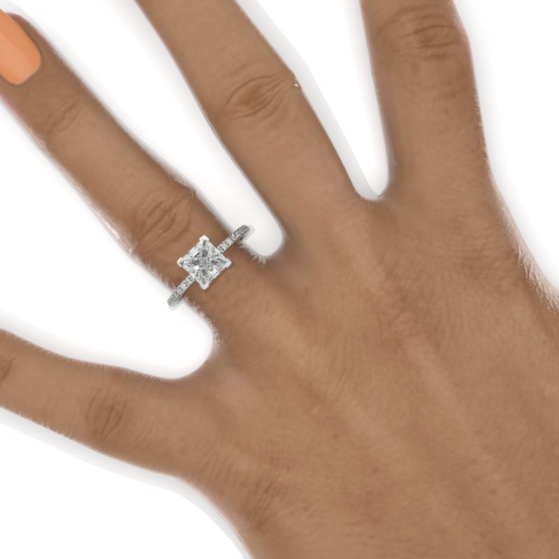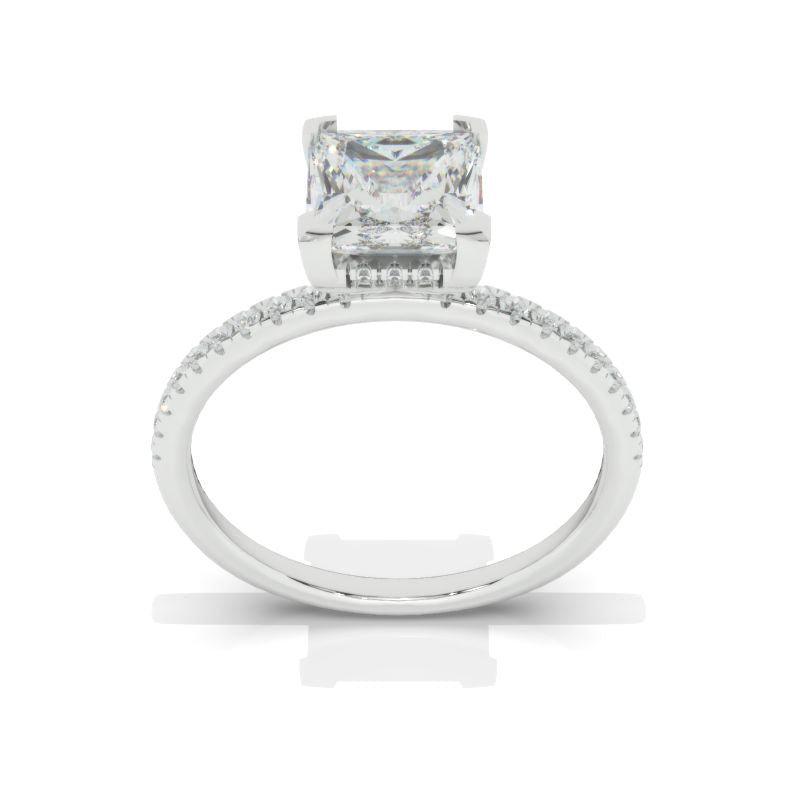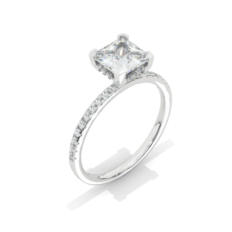 The default design option features 6.5mm Princess Cut Giliarto Moissanite/Forever One Moissanite/LAB Grown Diamond Center Stone DEFcolor, SI1-Clarity, VG-Cut, Ex-Polish, VG-Symmetry