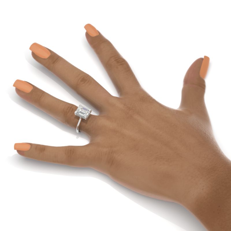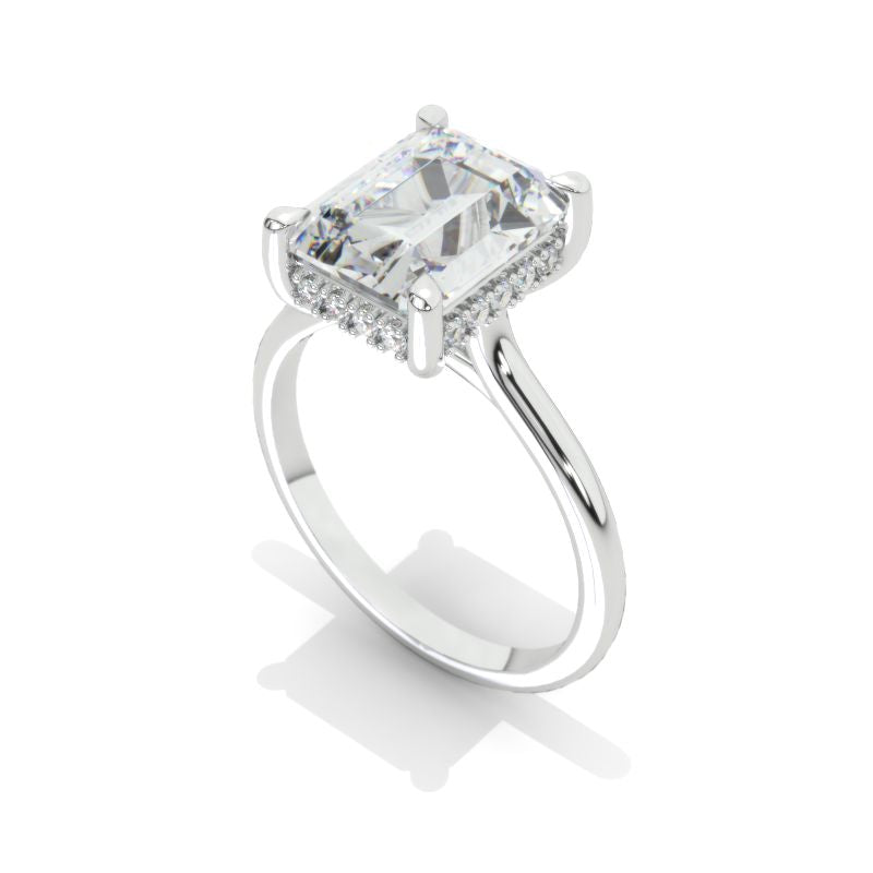 The default design option features 3 Carat 10x8mm Emerald Cut Giliarto Moissanite/Forever One Moissanite/LAB Grown Diamond Center Stone DEFcolor, SI1-Clarity, VG-Cut, Ex-Polish, VG-Symmetry