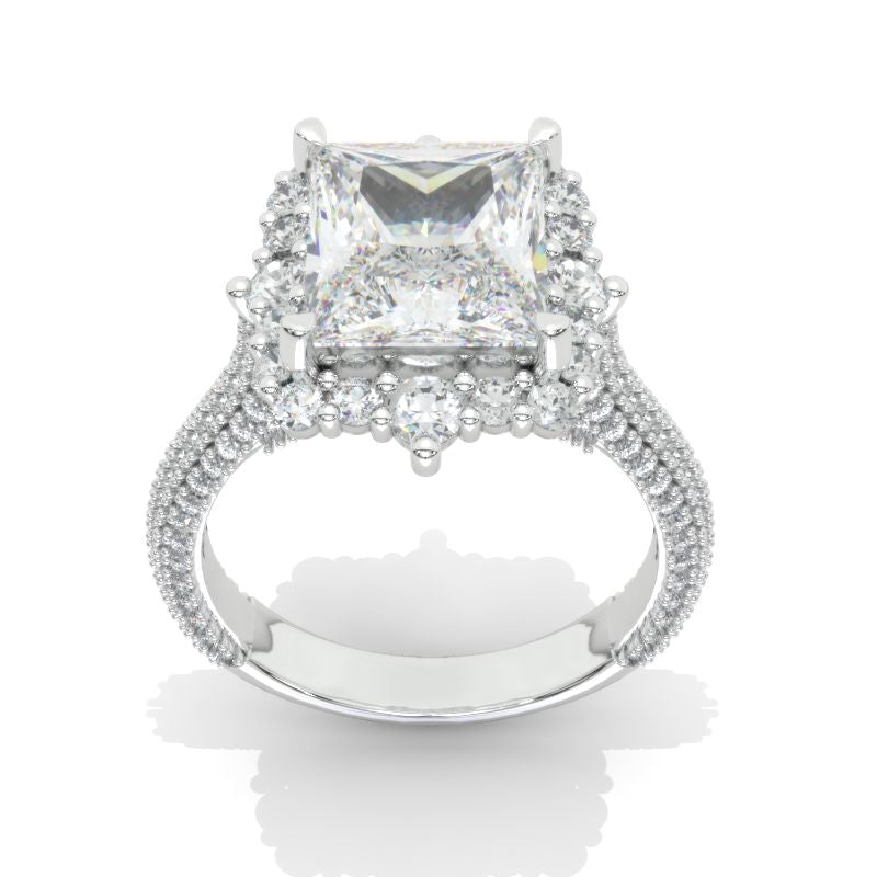 The default design option features 4 Carat 10x8mm Radiant Cut Giliarto Moissanite Center Stone D-Colorless,VVS1-Clarity, VG-Cut, Ex-Polish, VG-Symmetry