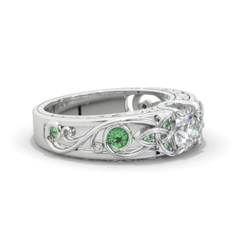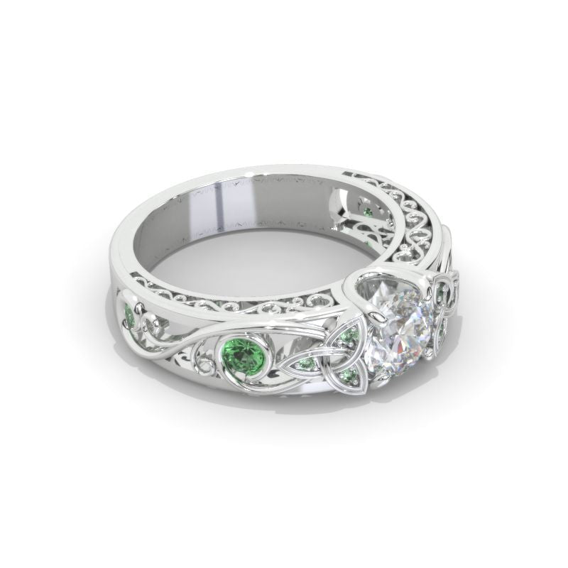 On the image featured Celtic  round moissanite 6mm D -Color, I1-Clarity,  VG-Symmetry  with 10 - 0.25 CTW  Lab-Grown Emerald accent stones 14K White Gold  Ring.