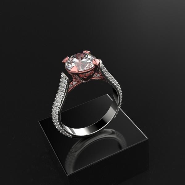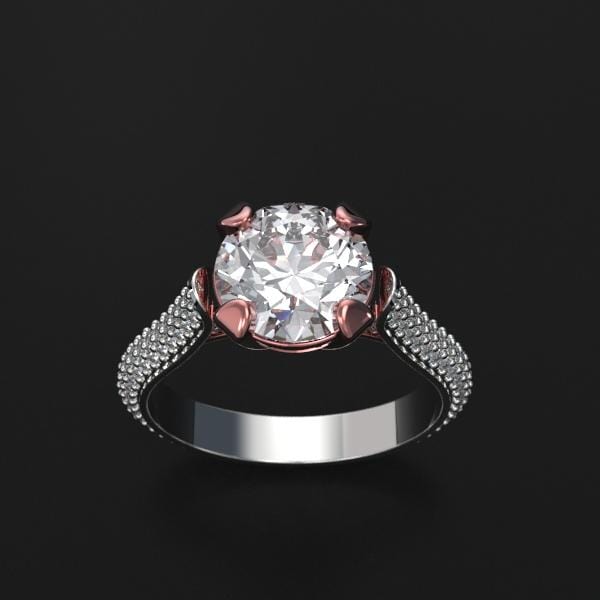 2.0 carat One Moissanite center stone ( round 8 mm, H-Color, I2-Clarity, Ex-Cut, Ex-Polish, VG-Symmetry) and 146 diamond accent stones (0.6 CTW G-H color, I1 clarity) with 14K white/rose gold.