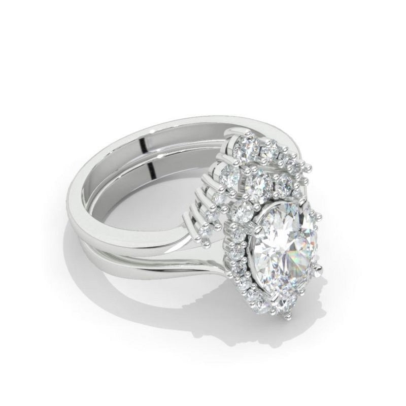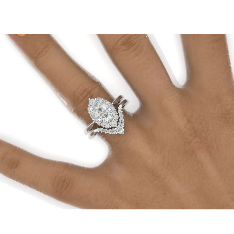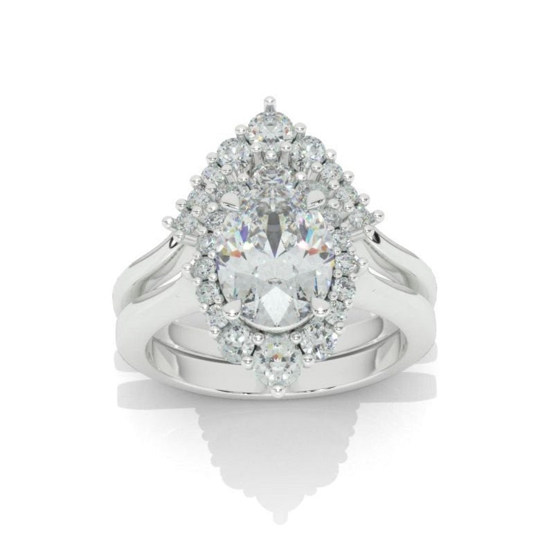 The default design option features 10x8 mm Oval Halo Round Cut Moissanite Stone
