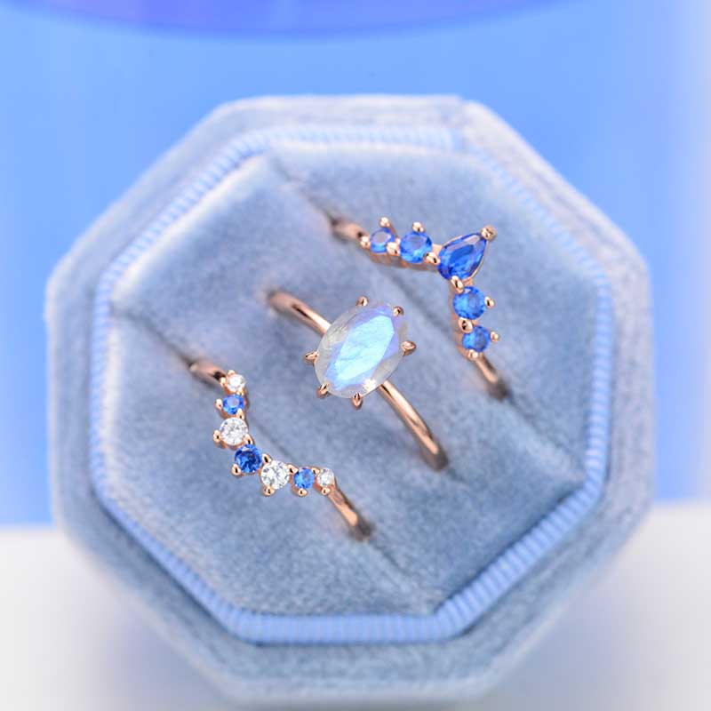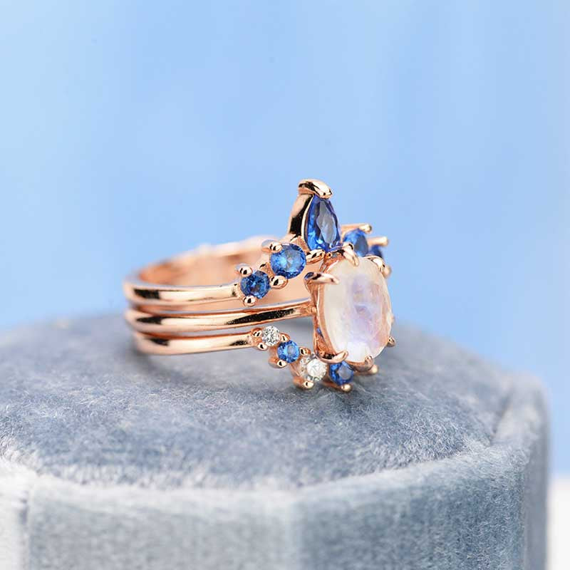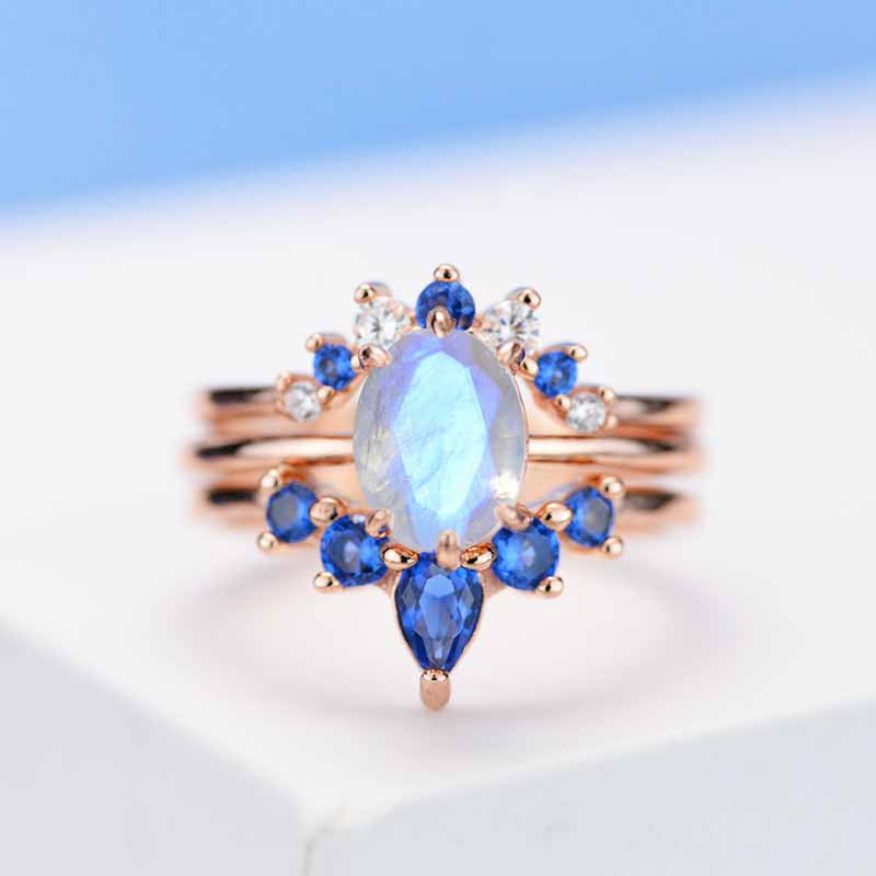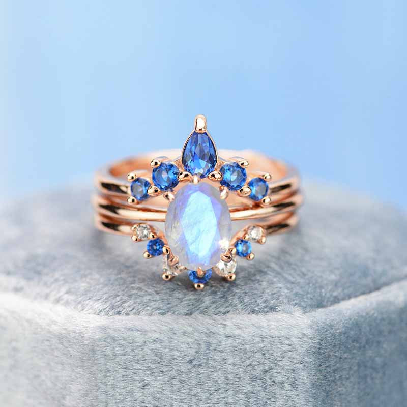 Vintage Design Genuine 2 Carat Oval Cut Moonstone Ring- Three Ring Set.