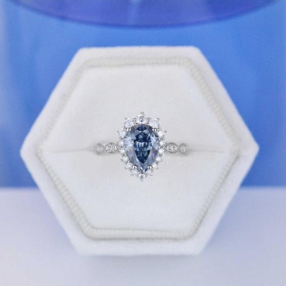 2 Carat Pear Cut Blue Moissanite Halo 14K White Gold Engagement Ring