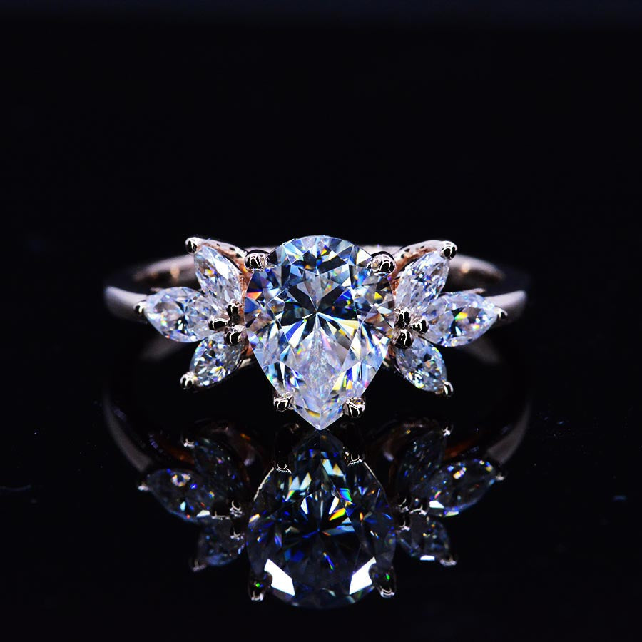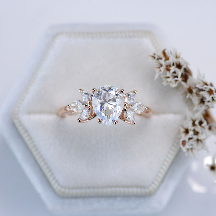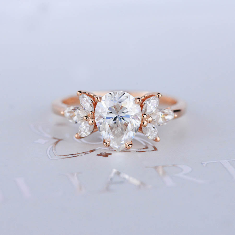 Pear Shaped Moissanite Engagement Ring. Vintage Unique Marquise Cut Cluster Engagement Ring