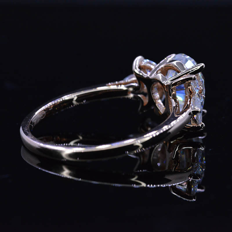 The default design option features 9x7mm Pear Cut Moissanite Stone D - color, SI1-Clarity, VG-Cut, Ex-Polish, VG-Symmetry Set with D-Colorless Accent Moissanite Stones in 14K Rose Gold Engagement Ring.