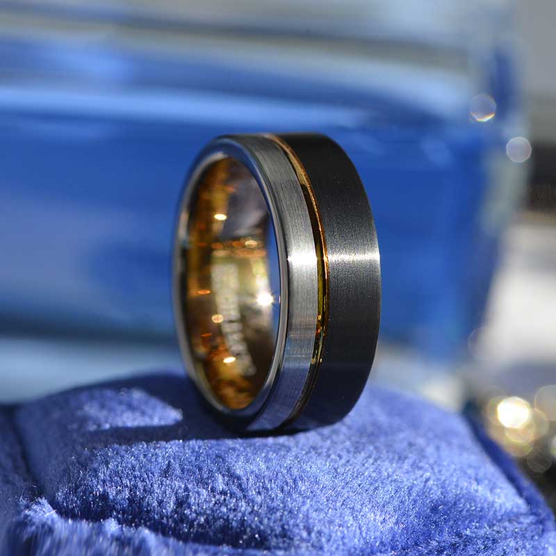 Color: Black, Silver & Rose Gold Metal: Tungsten Carbide Band Fit: Comfort Width: 8mm Style: Modern Other Details: Brushed black & silver with a rose gold accent stripe