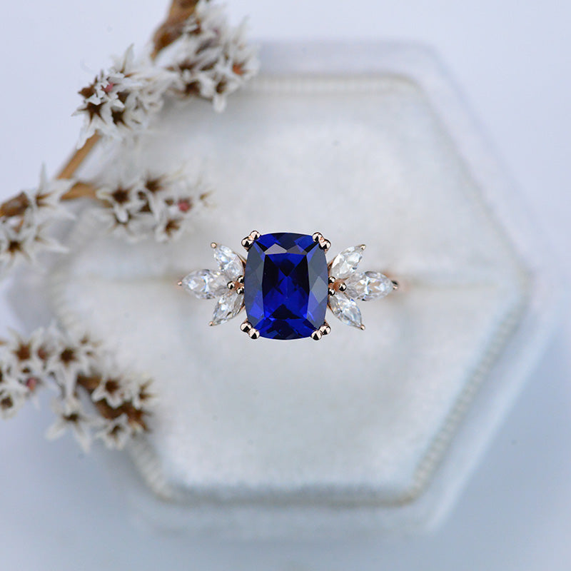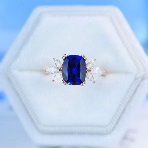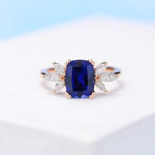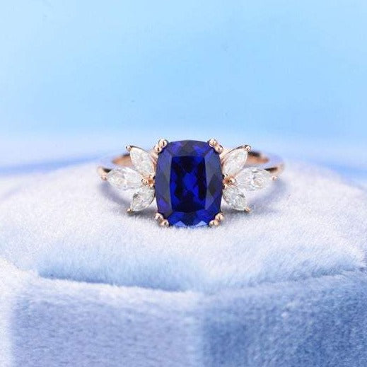 Cushion Shape Sapphire Engagement ring with Moissanite Accents Stones Ring.